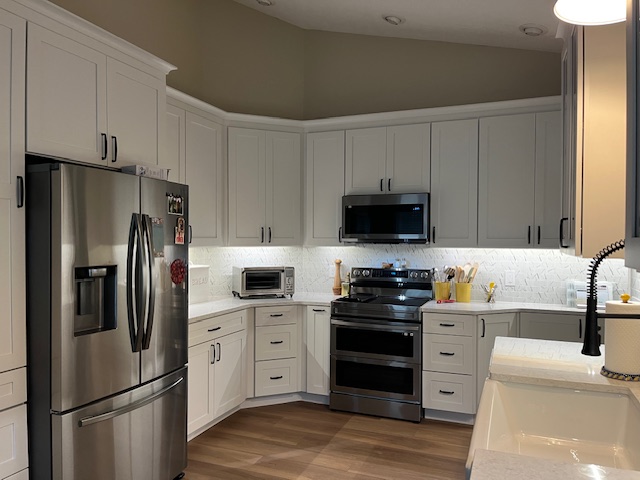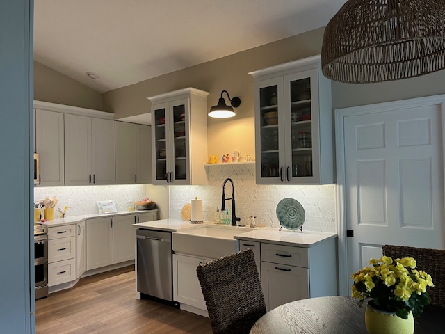 The renovation included installing new flooring, new cabinetry, beautiful countertops, and updated lighting for a bright, modern look. A new sink and a stylish tile backsplash completed the transformation.
